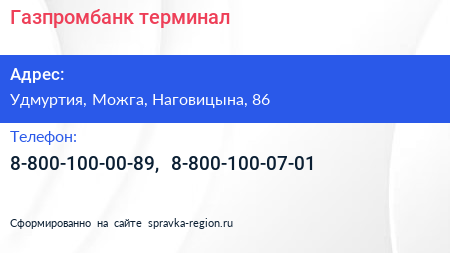 Газпромбанк, терминал по адресу Удмуртия, Можга, Наговицына, 86 в дальнейшем Организация, размещена в следующих категориях: