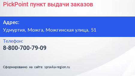 PickPoint, пункт выдачи заказов по адресу Удмуртия, Можга, Можгинская улица, 51 в дальнейшем Организация, размещена в следующих категориях: