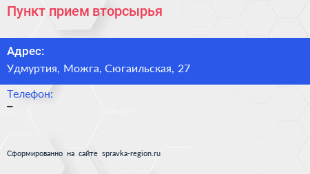 Пункт прием вторсырья по адресу Удмуртия, Можга, Сюгаильская, 27 в дальнейшем Организация, размещена в следующих категориях: