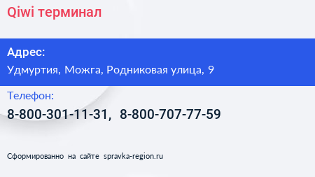 Qiwi, терминал по адресу Удмуртия, Можга, Родниковая улица, 9 в дальнейшем Организация, размещена в следующих категориях: