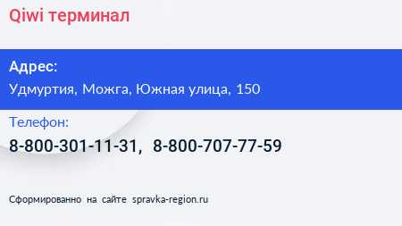 Qiwi, терминал по адресу Удмуртия, Можга, Южная улица, 150 в дальнейшем Организация, размещена в следующих категориях: