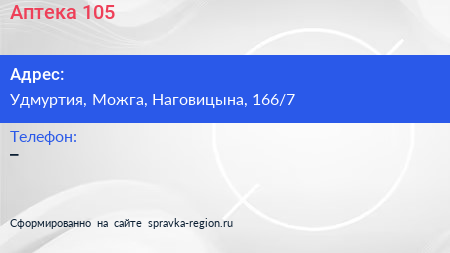 Аптека №105 по адресу Удмуртия, Можга, Наговицына, 166/7 в дальнейшем Организация, размещена в следующих категориях: