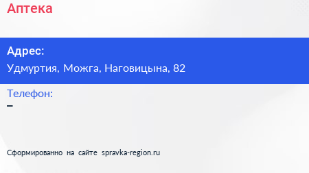 Аптека по адресу Удмуртия, Можга, Наговицына, 82 в дальнейшем Организация, размещена в следующих категориях: