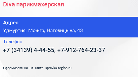 Diva, парикмахерская по адресу Удмуртия, Можга, Наговицына, 43 в дальнейшем Организация, размещена в следующих категориях: