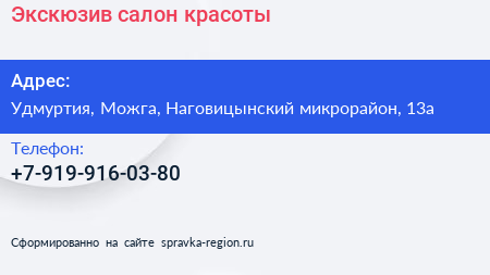 Экскюзив, салон красоты по адресу Удмуртия, Можга, Наговицынский микрорайон, 13а в дальнейшем Организация, размещена в следующих категориях: