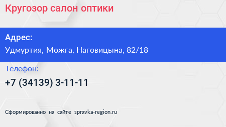 Кругозор, салон оптики по адресу Удмуртия, Можга, Наговицына, 82/18 в дальнейшем Организация, размещена в следующих категориях: