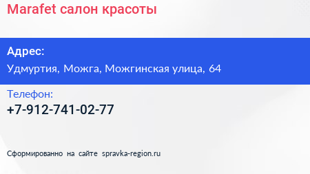 Marafet, салон красоты по адресу Удмуртия, Можга, Можгинская улица, 64 в дальнейшем Организация, размещена в следующих категориях: