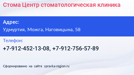 Стома Центр, стоматологическая клиника по адресу Удмуртия, Можга, Наговицына, 58 в дальнейшем Организация, размещена в следующих категориях: