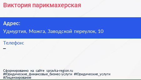 Виктория, парикмахерская по адресу Удмуртия, Можга, Заводской переулок, 10 в дальнейшем Организация, размещена в следующих категориях: