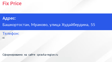 Fix Price по адресу Башкортостан, Мраково, улица Худайбердина, 55 в дальнейшем Организация, размещена в следующих категориях: