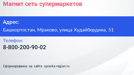 Магнит, сеть супермаркетов по адресу Башкортостан, Мраково, улица Худайбердина, 51 в дальнейшем Организация, размещена в следующих категориях: