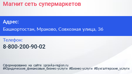 Магнит, сеть супермаркетов по адресу Башкортостан, Мраково, Совхозная улица, 36 в дальнейшем Организация, размещена в следующих категориях: