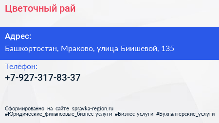 Цветочный рай по адресу Башкортостан, Мраково, улица Биишевой, 135 в дальнейшем Организация, размещена в следующих категориях: