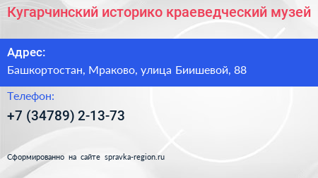 Кугарчинский историко-краеведческий музей по адресу Башкортостан, Мраково, улица Биишевой, 88 в дальнейшем Организация, размещена в следующих категориях: