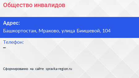 Общество инвалидов по адресу Башкортостан, Мраково, улица Биишевой, 104 в дальнейшем Организация, размещена в следующих категориях: