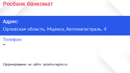 Росбанк, банкомат по адресу Орловская область, Мценск, Автомагистраль, 4 в дальнейшем Организация, размещена в следующих категориях: