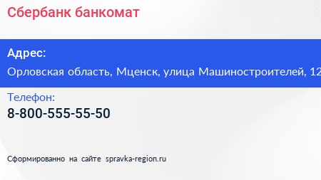 Сбербанк, банкомат по адресу Орловская область, Мценск, улица Машиностроителей, 12 в дальнейшем Организация, размещена в следующих категориях: