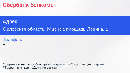Сбербанк, банкомат по адресу Орловская область, Мценск, площадь Ленина, 1 в дальнейшем Организация, размещена в следующих категориях: