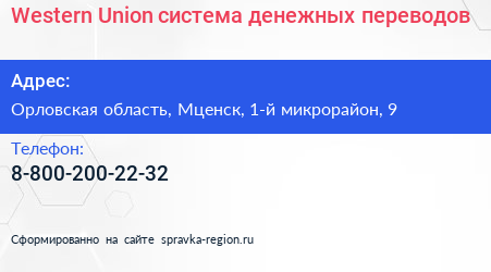 Western Union, система денежных переводов по адресу Орловская область, Мценск, 1-й микрорайон, 9 в дальнейшем Организация, размещена в следующих категориях: