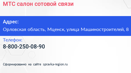 МТС, салон сотовой связи по адресу Орловская область, Мценск, улица Машиностроителей, 8 в дальнейшем Организация, размещена в следующих категориях:
