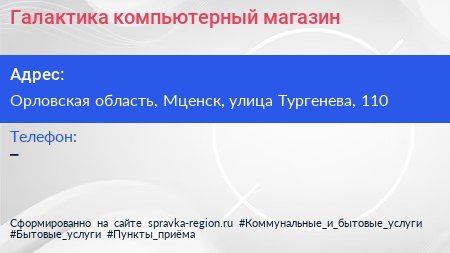 Галактика, компьютерный магазин по адресу Орловская область, Мценск, улица Тургенева, 110 в дальнейшем Организация, размещена в следующих категориях: