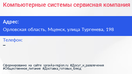 Компьютерные системы, сервисная компания по адресу Орловская область, Мценск, улица Тургенева, 198 в дальнейшем Организация, размещена в следующих категориях: