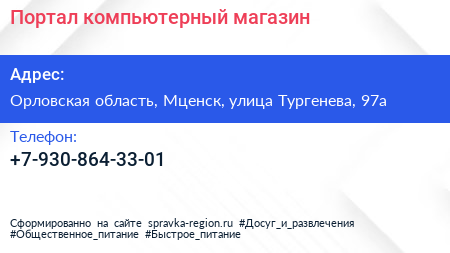 Портал, компьютерный магазин по адресу Орловская область, Мценск, улица Тургенева, 97а в дальнейшем Организация, размещена в следующих категориях: