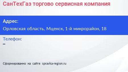 СанТехГаз, торгово-сервисная компания по адресу Орловская область, Мценск, 1-й микрорайон, 18 в дальнейшем Организация, размещена в следующих категориях: