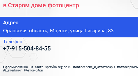 в Старом доме, фотоцентр по адресу Орловская область, Мценск, улица Гагарина, 83 в дальнейшем Организация, размещена в следующих категориях:
