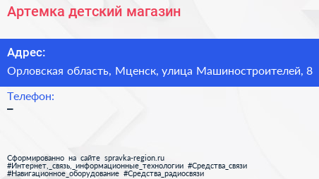 Артемка, детский магазин по адресу Орловская область, Мценск, улица Машиностроителей, 8 в дальнейшем Организация, размещена в следующих категориях: