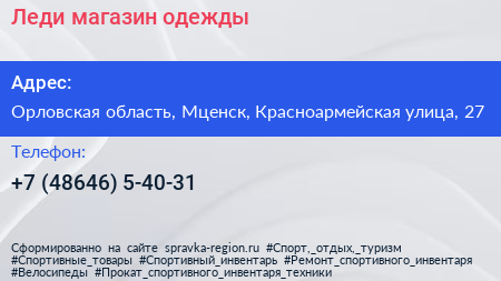 Леди, магазин одежды по адресу Орловская область, Мценск, Красноармейская улица, 27 в дальнейшем Организация, размещена в следующих категориях: