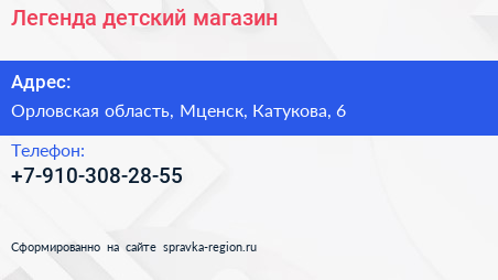 Легенда, детский магазин по адресу Орловская область, Мценск, Катукова, 6 в дальнейшем Организация, размещена в следующих категориях: