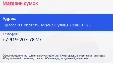 Магазин сумок по адресу Орловская область, Мценск, улица Ленина, 25 в дальнейшем Организация, размещена в следующих категориях: