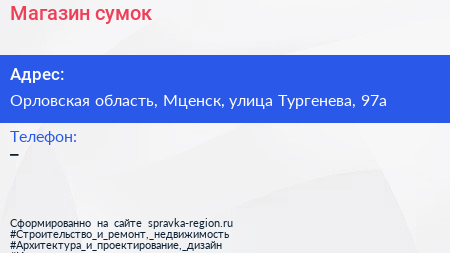 Магазин сумок по адресу Орловская область, Мценск, улица Тургенева, 97а в дальнейшем Организация, размещена в следующих категориях: