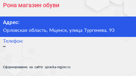 Рона, магазин обуви по адресу Орловская область, Мценск, улица Тургенева, 93 в дальнейшем Организация, размещена в следующих категориях: