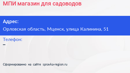 МПИ, магазин для садоводов по адресу Орловская область, Мценск, улица Калинина, 51 в дальнейшем Организация, размещена в следующих категориях: