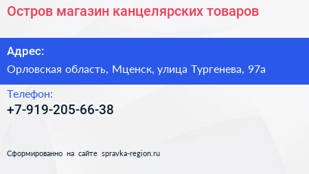 Остров, магазин канцелярских товаров по адресу Орловская область, Мценск, улица Тургенева, 97а в дальнейшем Организация, размещена в следующих категориях: