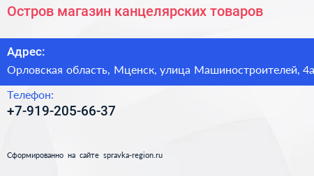 Остров, магазин канцелярских товаров по адресу Орловская область, Мценск, улица Машиностроителей, 4а в дальнейшем Организация, размещена в следующих категориях: