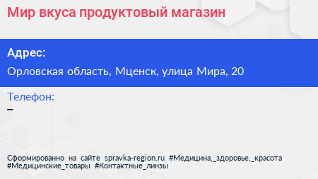 Мир вкуса, продуктовый магазин по адресу Орловская область, Мценск, улица Мира, 20 в дальнейшем Организация, размещена в следующих категориях: