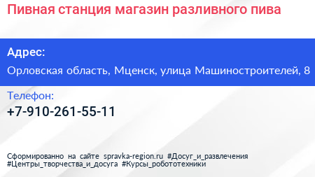 Пивная станция, магазин разливного пива по адресу Орловская область, Мценск, улица Машиностроителей, 8 в дальнейшем Организация, размещена в следующих категориях: