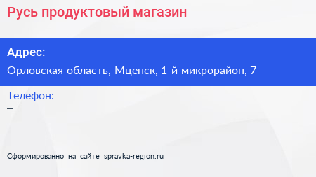 Русь, продуктовый магазин по адресу Орловская область, Мценск, 1-й микрорайон, 7 в дальнейшем Организация, размещена в следующих категориях: