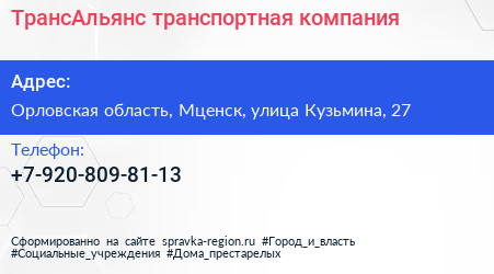 ТрансАльянс, транспортная компания по адресу Орловская область, Мценск, улица Кузьмина, 27 в дальнейшем Организация, размещена в следующих категориях: