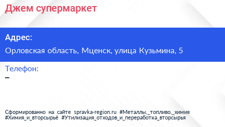 Джем, супермаркет по адресу Орловская область, Мценск, улица Кузьмина, 5 в дальнейшем Организация, размещена в следующих категориях: