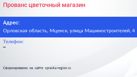Прованс, цветочный магазин по адресу Орловская область, Мценск, улица Машиностроителей, 4 в дальнейшем Организация, размещена в следующих категориях: