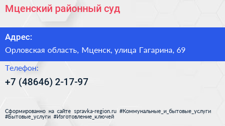 Мценский районный суд по адресу Орловская область, Мценск, улица Гагарина, 69 в дальнейшем Организация, размещена в следующих категориях: