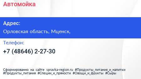 Автомойка по адресу Орловская область, Мценск, в дальнейшем Организация, размещена в следующих категориях:
