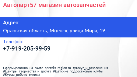 Автопарт57, магазин автозапчастей по адресу Орловская область, Мценск, улица Мира, 19 в дальнейшем Организация, размещена в следующих категориях: