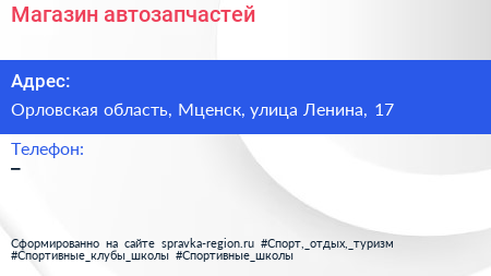 Магазин автозапчастей по адресу Орловская область, Мценск, улица Ленина, 17 в дальнейшем Организация, размещена в следующих категориях: