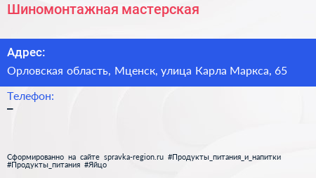 Шиномонтажная мастерская по адресу Орловская область, Мценск, улица Карла Маркса, 65 в дальнейшем Организация, размещена в следующих категориях:
