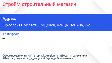 СтройМ, строительный магазин по адресу Орловская область, Мценск, улица Ленина, 62 в дальнейшем Организация, размещена в следующих категориях: